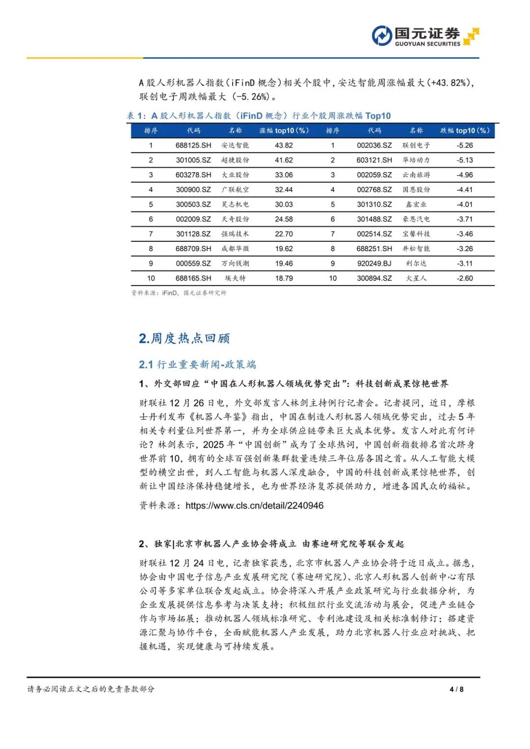A股人形机器人指数(iFinD概念)相关个股中,安达智能周涨幅最大(+43.82%),联创电子周跌幅最大(-5.26%)。