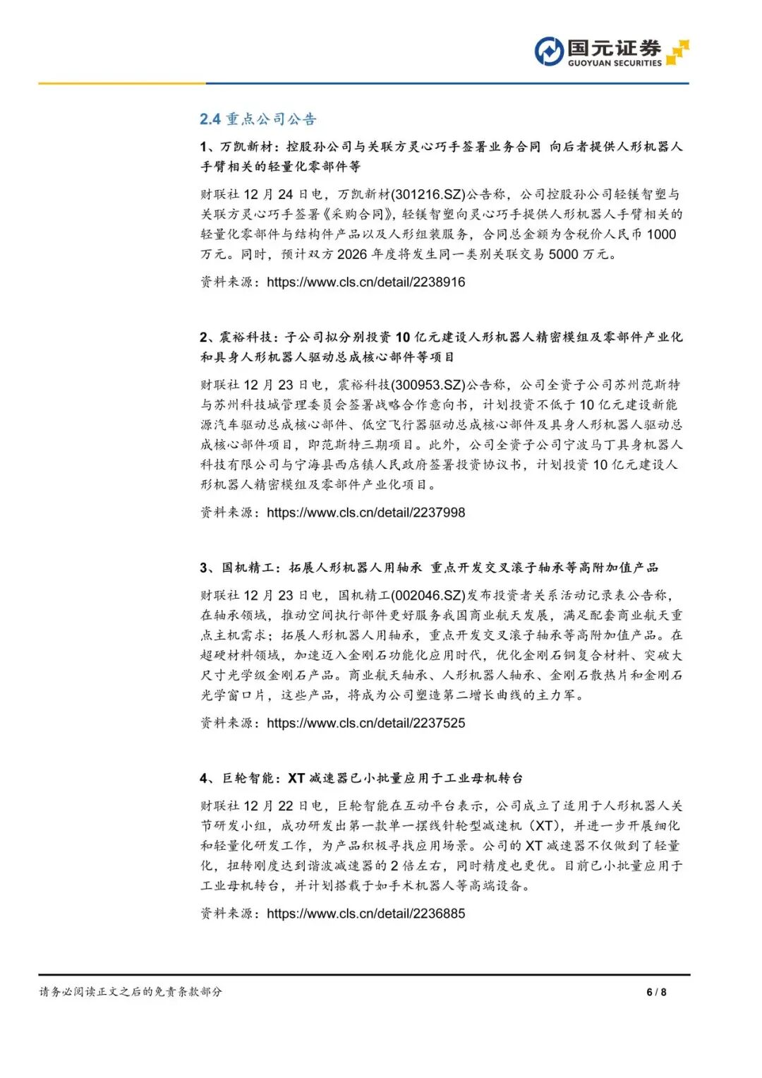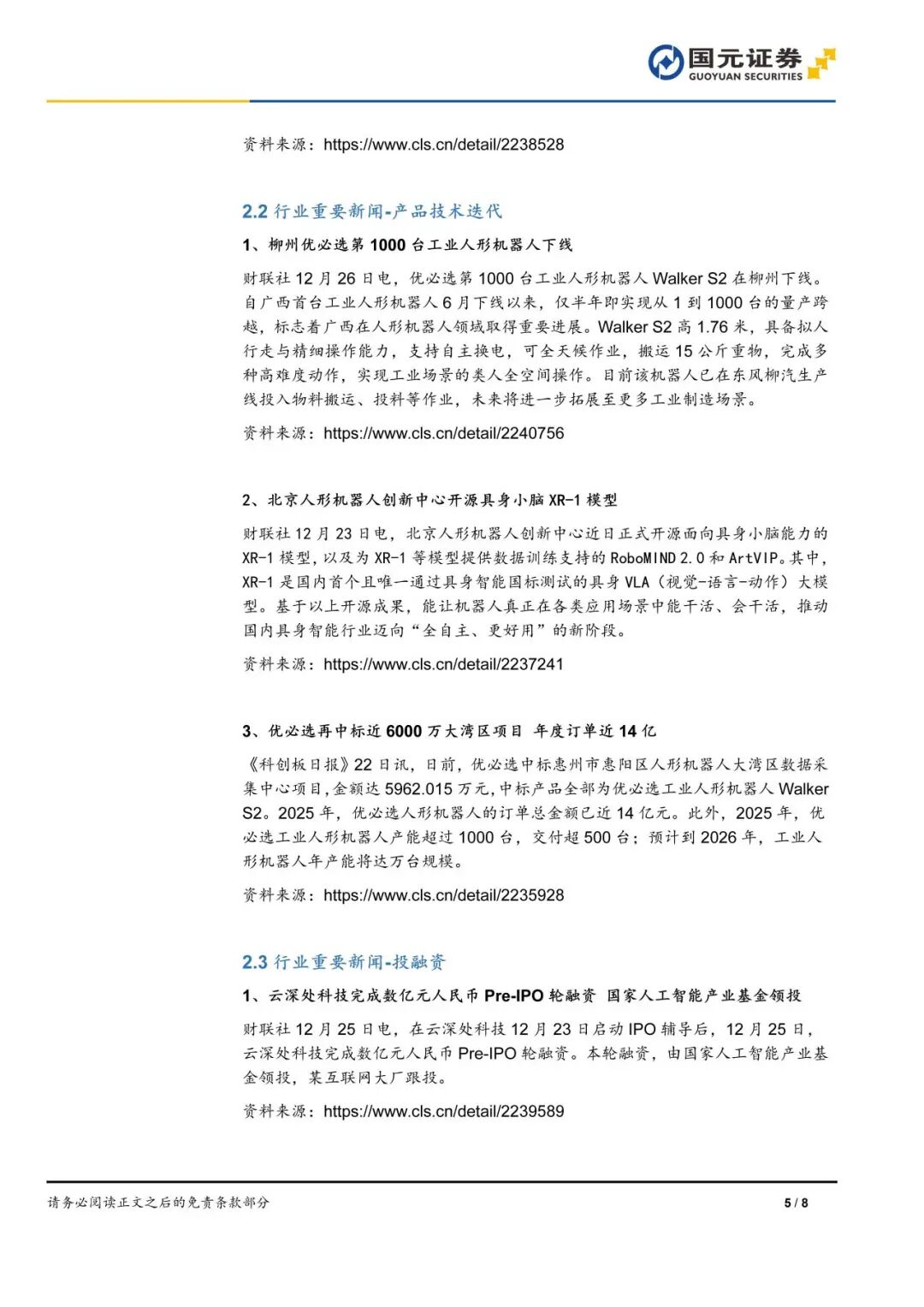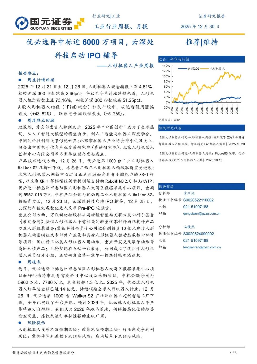 本报告摘自国元证券2025年12月30日已发布的《优必选再中标近6000万项目,云深处科技启动IPO辅导——人形机器人产业周报》,具体报告及分析内容请详见报告。若因对报告的摘编等产生歧义,应以报告发布当日的完整内容为准。