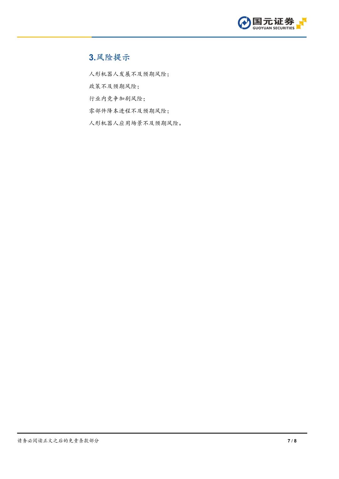 人形机器人发展不及预期风险;政策不及预期风险;行业内竞争加剧风险;零部件降本进程不及预期风险;应用场景不及预期风险。