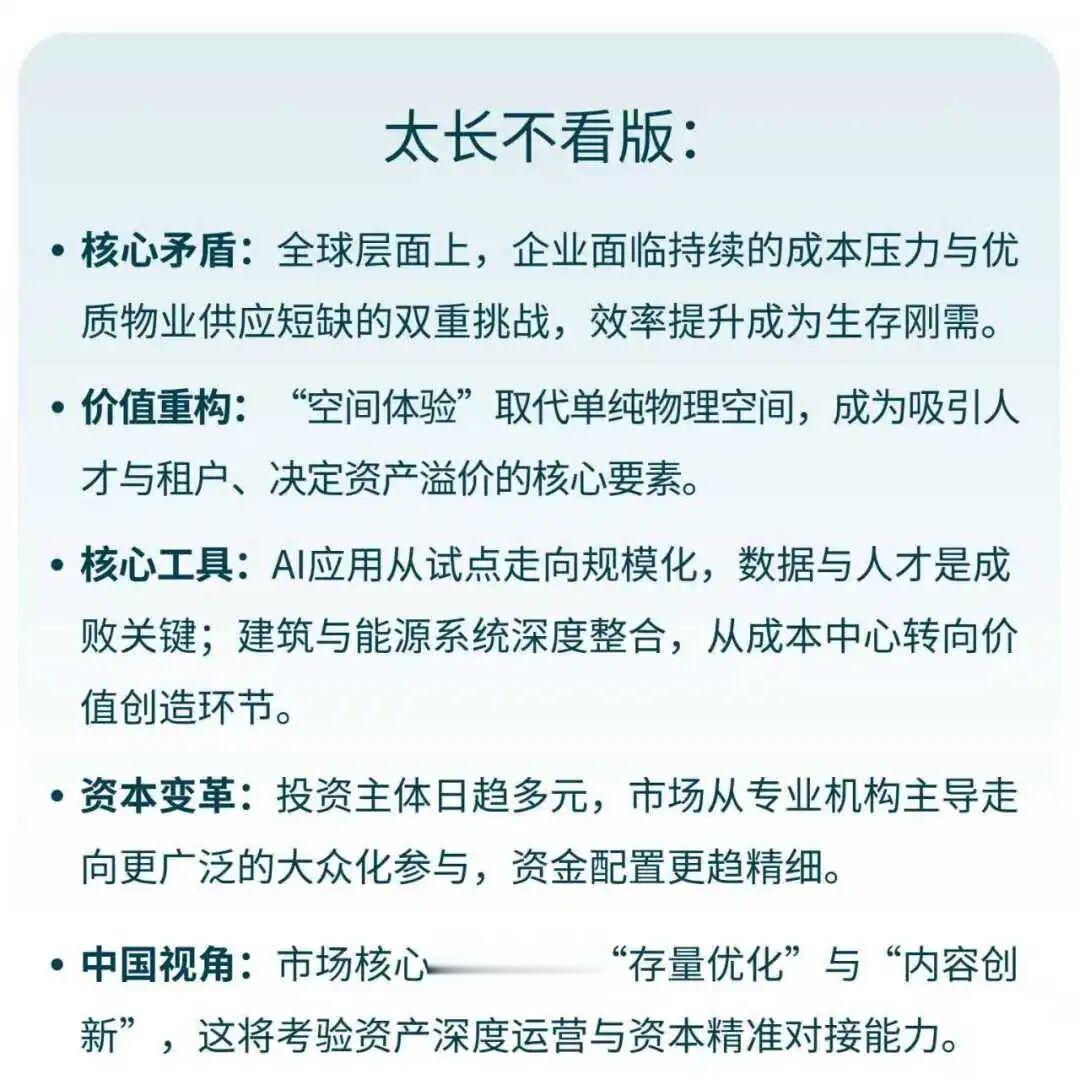 全球商业地产市场正在回归对资产本质的审视。对投资者而言,这意味着从单纯关注资产规模转向关注资产质量。那些能够通过精细化运营提升效率、通过空间优化提升租户粘性、通过能源管理创造可持续价值的资产,将在市场调整期展现出更强的韧性。