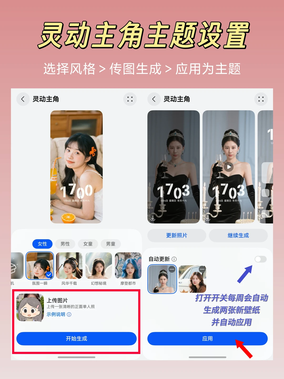 还能设置成动态锁屏主题,一两分钟就做好了 女生版本有古风、新中式、民族风等7种风格,还有男生和小朋友的模板,全家人的新年写真Mate 80灵动主角主题都承包了[斜眼R] 每次锁屏都能换张美照,还能存图发朋友圈~ 设置成自动更新,每周都会自动生成2张新照片并自动应用为主题壁纸,周周都有好心情[派对R] 宝子们快去试试吧,评论区等大家发美照哟~