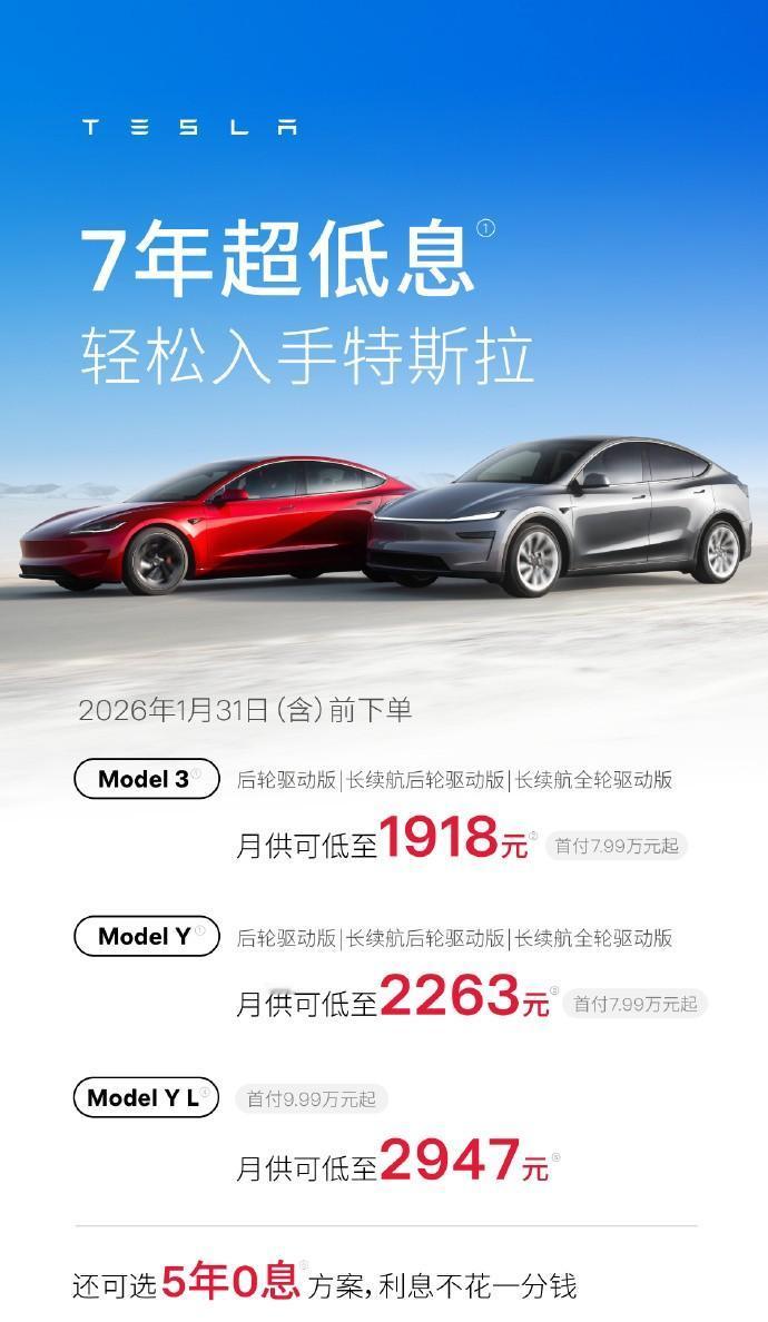 当其他车企继续直接动价格或以兜底购置税的形式促销时,特斯拉的动作也来了,是熟悉的配方——打金融购车牌、不动价格,只是不同的是特斯拉首次推出5年0息,还有7年周期的贷款购车方案,限定1月31日(含)的下单。 在5年0息方案中,以Model Y L为例,首付9.99万起,月供最低3985元; 在7年低息方案中,同样首付9.99万元起,Model Y L支持月供最低2947元; 问题来了,你是愿意选择5年0息方案还是7年低息方案? 建议大家从以下3个维度去考虑: 1、你是否会拥有一台车超过5年?尤其是拥有一台电车超过5年? 2、你是否了解相关金融购车政策,如提前还贷需要支付违约金? 3、你是否有相应的贷款偿还能力?尤其是在看到首付最低7.99万元就可以买Model 3与Model Y时(7年低息方案)。 总体来看,上述促销方案有一定吸引力。 此外,特斯拉在此次促销中,还推出“海洋蓝”新车色,选装价8000元,听起来不算便宜,不过特斯拉也同步给出条款:经特斯拉车主引荐可享8000元车漆选装礼金。简单理解,新车色可“有条件下免费”。该条款显得“聪明”,一方面表明新车色的价值,另一方面有望通过“老带新”扩大线索量并促进成交。【来自懂车帝车友圈】