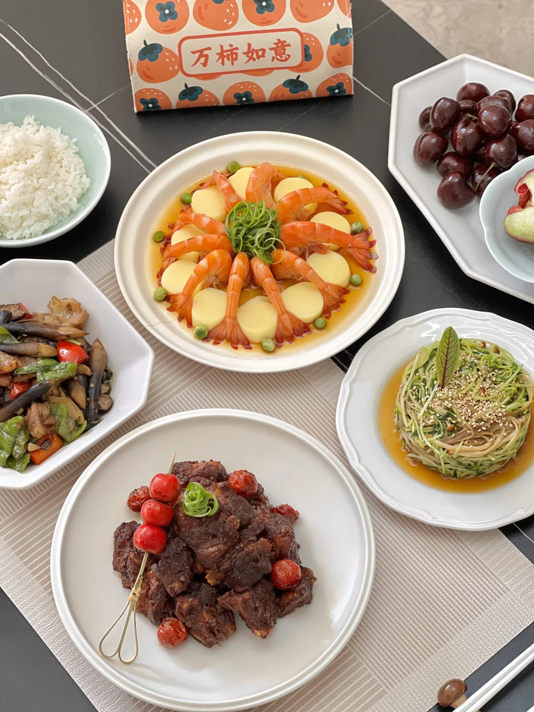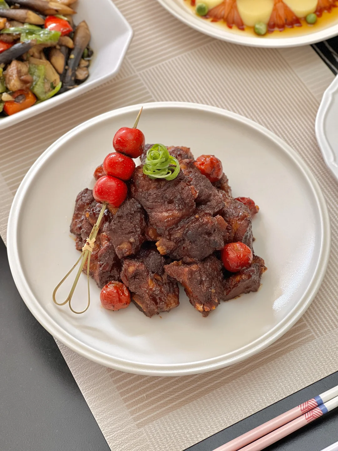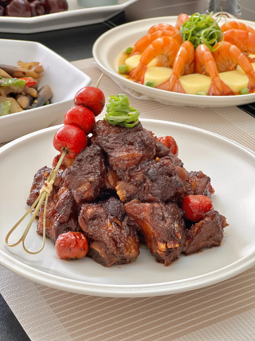 开年第一餐,认真对待[派对R]山楂烧排骨,酸酸的山楂刚好中和排骨的油腻,一点点酸甜味,太下饭啦~之前好像没自己做过鸡纵菌,和五花肉辣椒简简单单炒到一起,还能保留脆脆的口感,值得一试哦~ 【山楂烧排骨】 【玉子豆腐蒸虾】 【辣炒鸡纵菌】 【芝麻豌豆苗】