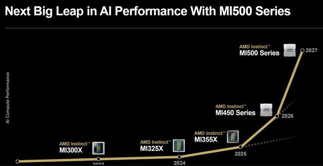 AMD一方面用MI440X切入更广泛的企业本地(on-prem)数据中心场景,强调在既有机房里以紧凑形态部署训练/微调/推理并实现数据留存与合规;另一方面把MI455X与“Helios”机柜系统、以及新一代VeniceCPU捆绑叙事,借OpenAI高层同台背书强化“AI算力缺口仍在扩大”的需求可见度,并将产品路线外推到2027年的MI500系列,给出相对MI300“最高千倍性能跃迁”的长期上行想象空间。