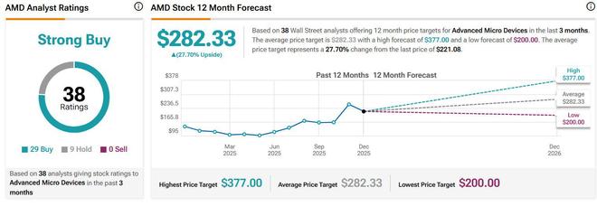 TIPRANKS汇编的华尔街分析师平均目标价显示,分析师们对于AMD的平均目标价预期高达282.33美元,意味着未来12个月内潜在涨幅至少高达28%,最高目标股价则为知名投资机构RaymondJames首次覆盖AMD股票即给出的高达377美元这一牛市目标价。