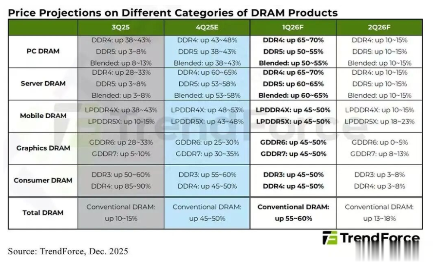 服务器DRAM的涨价并非孤立现象,其影响正迅速蔓延至整个存储市场,形成全品类普涨格局。由于三星、SK海力士将先进制程大量转移至服务器及HBM产品,通用型DRAM供应严重紧缩,TrendForce预测2026年一季度通用DRAM合约价将环比上涨55%-60%。其中,PC端DDR4涨价65%-70%,移动设备用LPDDR4X/5X涨价45%-50%,消费级存储产品价格也已较2025年初上涨2-3倍。
