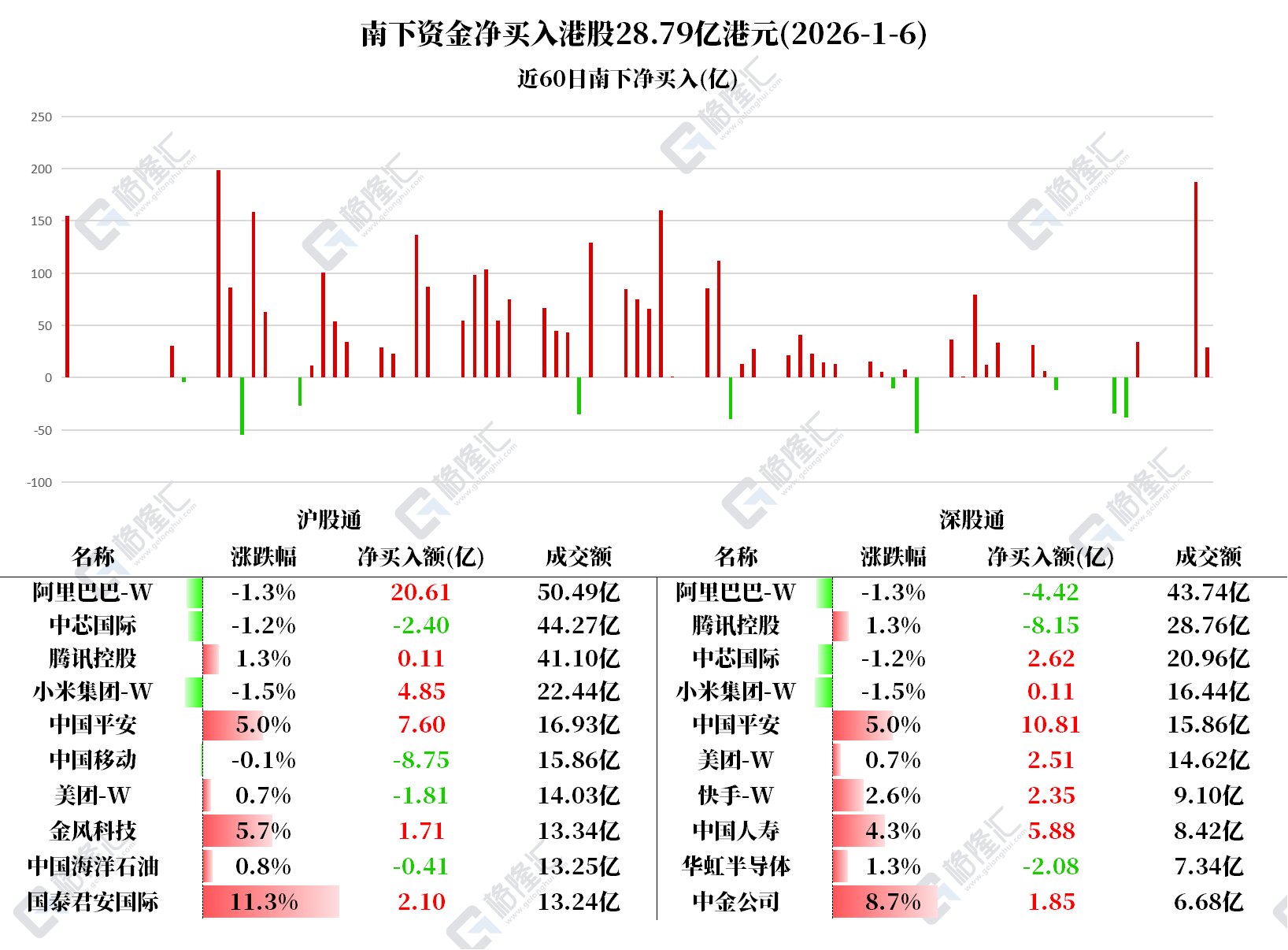 净买入中国平安18.4亿、阿里巴巴-W16.19亿、中国人寿5.88亿、小米集团-W4.96亿、快手-W2.34亿、国泰君安国际2.09亿、中金公司1.85亿、金风科技1.7亿;