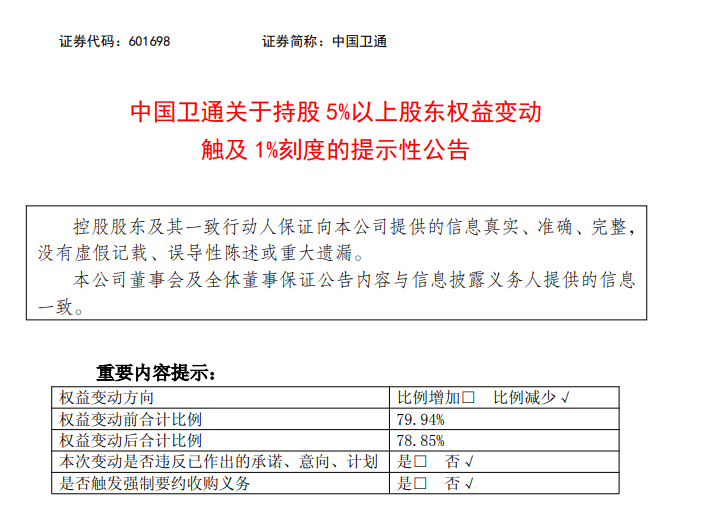 同日,中国卫通公告称,公司控股股东航天科技集团因可交换债券换股,导致其直接持有的公司股份数量减少,合计持股比例由79.94%减少至78.85%。此次权益变动不涉及要约收购,不会导致公司控股股东及实际控制人发生变化。