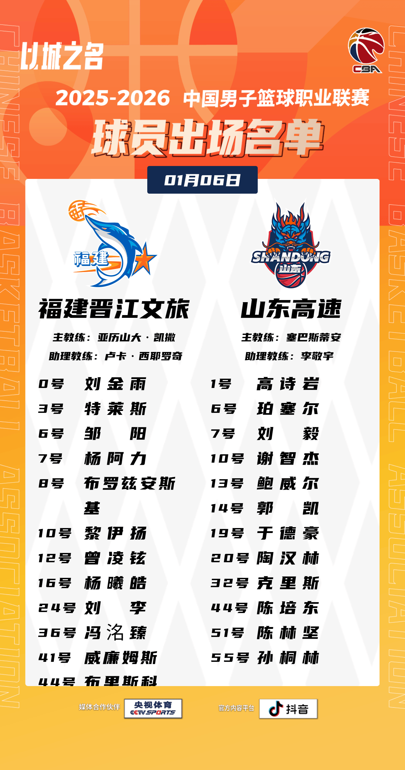 虎扑01月06日讯今晚CBA常规赛,福建对阵山东的大名单已经公布。