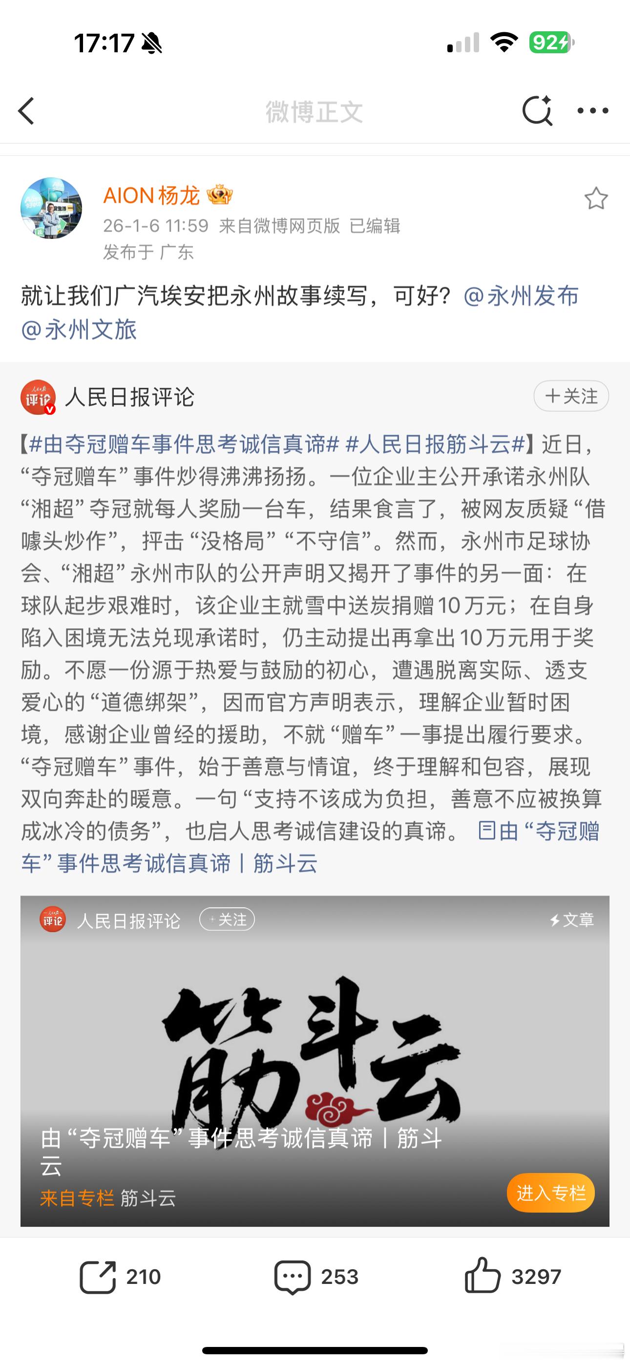 “夺冠赠车”事件从一场商业承诺的争议,悄然升华为一场关于善意、诚信与包容的社会风气之思。它不再仅仅关乎“是否该兑现一辆车”,而是揭示了更深层的命题:当纯粹的善意遇上现实的困境,社会如何以更具建设性的姿态,守护那份最初的初心,并推动其正向循环?广汽埃安提出“续写永州故事”,正是敏锐地把握并主动融入了这一正在成型的社会共识。其行动远非一次简单的商业“补位”,其深刻魅力在于,它以建设者的姿态,完成了一次有意识的价值接力。这标志着企业社会责任认知的升华:从单纯的公益“履约者”,升维成为社会诚信生态的“共建者”。杨总的一句“续写”,不仅是对事件本身的温暖接续,更是将“支持不该成为负担”的包容性理解,转化为“让善意可持续流动”的创造性实践。它示范了一条新路径:以共同叙事凝聚多元善意,将可能对立的契约与情感,转化为共创、共担、共享的发展合力。这无疑标志着一种社会进步:我们正逐渐超越对诚信“非黑即白”的刚性审判,转向培育更具韧性、更富温度的“诚信生态”。它既强调承诺的严肃,也珍视善意的初心;既维护契约精神,也包容困境中的坦诚与修复。永州球队的体谅、本土企业的接力、广汽埃安的响应,共同构成了这种良善风气的生动注脚。因此,广汽埃安所“续写”的,早已超越一个赠车承诺,而是一个关于担当、包容与共生的现代寓言。它预示着,真正的商业向善,是能深刻读懂社会脉动,并以自身行动将商业力量嵌入社会价值生长的脉络,成为推动风气向上、善意循环的积极变量。这不仅是品牌的格局,更是一种推动社会向好的智慧。风气已成,未来可期。人民日报筋斗云由夺冠赠车事件思考诚信真谛