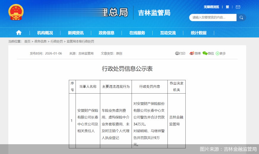 北京商报讯(记者李秀梅)1月6日,吉林金融监管局发布行政处罚信息显示,安盟财产保险有限公司长春中心支公司及相关责任人,因存在车险业务虚列费用、虚构保险中介业务套取费用、未及时注销个人代理人执业登记的违法违规行为,吉林金融监管局对安盟财产保险股份有限公司长春中心支公司警告并合计罚款34万元。对胡明明、马继祥警告并罚款共计9万元。