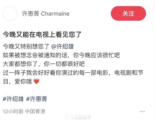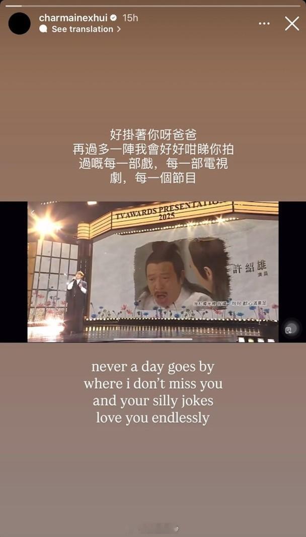【On.cc】台慶頒獎禮播許紹雄生前作品致敬 愛女感性發文:今晚又特別想你了!「最強綠葉」許紹雄離世,令人惋惜!前晚(4日)台慶頒獎禮悼念藝人環節中,大螢幕上播出許紹雄在電視劇、電影中的演出片段,又略過許紹雄和周驄電影《新紮師妹》經典片段,悼念兩位老前輩,現場的佘詩曼和高海寧都難掩傷感。許紹雄女兒許惠菁亦收看頒獎典禮,看到爸爸的片段,在社交平台上發文:「今晚又特別想你了!」許惠菁在社交網轉發頒獎禮上播放許紹雄舊作的片段,她抒發思念之情道:「好掛着你呀爸爸,再過多一陣我會好好咁睇你拍過嘅每一部戲,每一部電視劇,每一個節目。」她在另一平台上再發文道:「今晚又特別想你了 如果被想念會被通知的話,你今晚應該會很忙吧,大家都想你了,你一切都很好吧!」不少人留言安慰鼓勵她。許紹雄離世,女兒許惠菁最傷最痛。台慶頒獎禮向穿許紹雄致敬。高海寧睇到眼濕濕。佘詩曼都好感觸。許惠菁都有睇頒獎禮,這個日子對亡父更思念。在電視看見爸爸,可是已天人永隔。