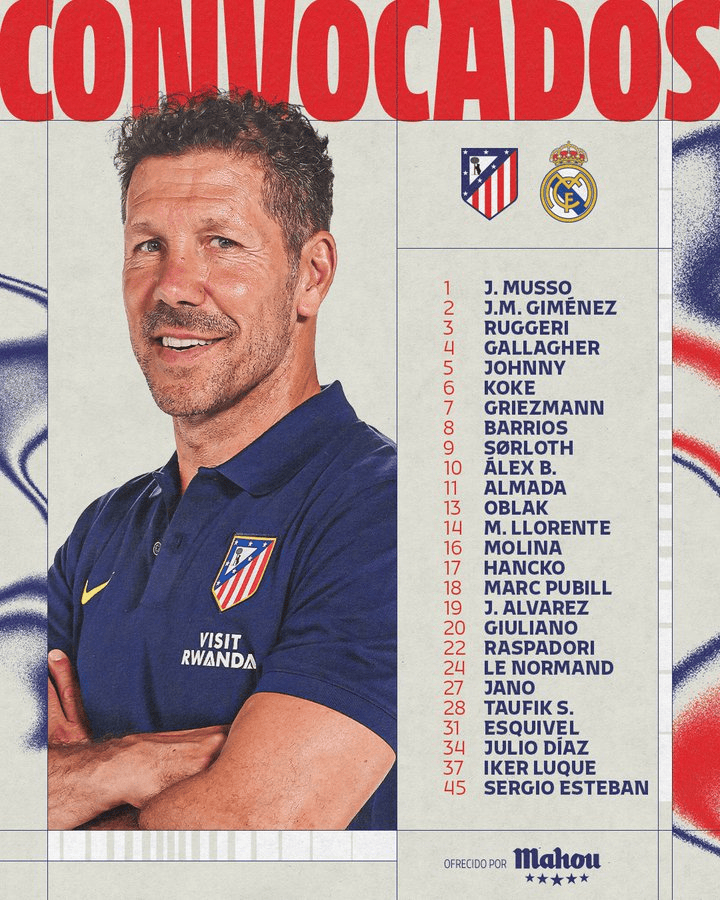 虎扑01月06日讯北京时间1月9日凌晨,西班牙超级杯半决赛,马德里竞技将对阵皇家马德里,赛前,马竞官方公布了本场比赛的大名单。