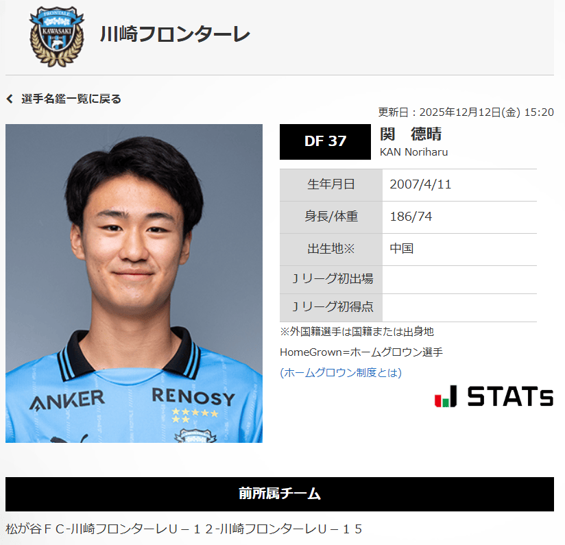 虎扑01月06日讯J1川崎前锋宣布了2026赛季球员名单,其中引人关注的是从U18升上一线队的小将关德晴,他将身披37号球衣。