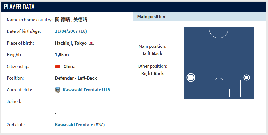 虽然川崎前锋官方并没有标明关德晴的国籍,但是在J联赛官网和德国转会市场上都标注他为中国国籍。另一个可以佐证点是他的姓名,虽然名字的念法是传统的日式发音,但是他的姓——关,却并非按照传统日式发音那样念seki,而是kan。