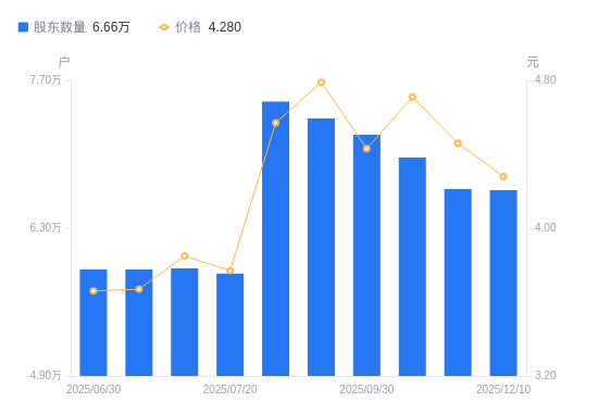 1月6日消息,数据显示,截至2025年10月31日,青松建化A股股东总户数为6.97万户,较上期(2025年9月30日)减少2163户,降幅3.01%。公司最新A股总股本为16.05亿股,其中流通A股13.79亿股,户均持有流通A股数量为1.98万股,较上期增加595.41股,增幅3.10%;户均持流通A股市值9.32万元,较上期增加8176.57元,增幅9.62%。