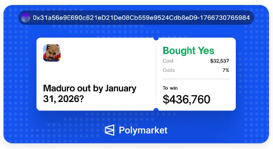 一位去年12月才注册Polymarket的用户,斥资32537美元押注“马杜罗将于2026年1月31日前下台”的可能性。而这笔投机性投注完成后不久,特朗普便于周六凌晨4点21分在社交平台TruthSocial上宣布了马杜罗被捕的消息。