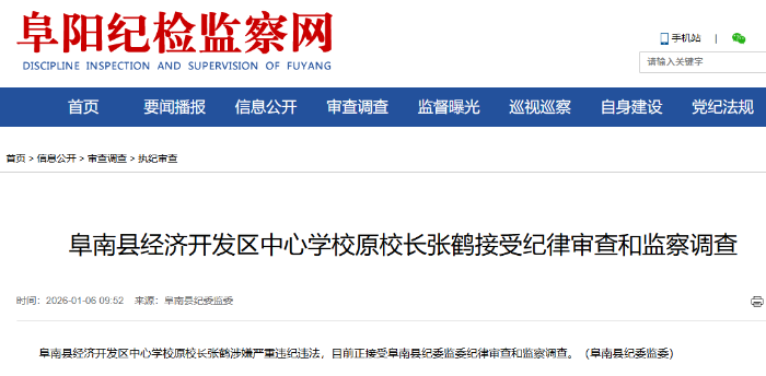 阜南县经济开发区中心学校原校长张鹤涉嫌严重违纪违法,目前正接受阜南县纪委监委纪律审查和监察调查。(阜南县纪委监委)