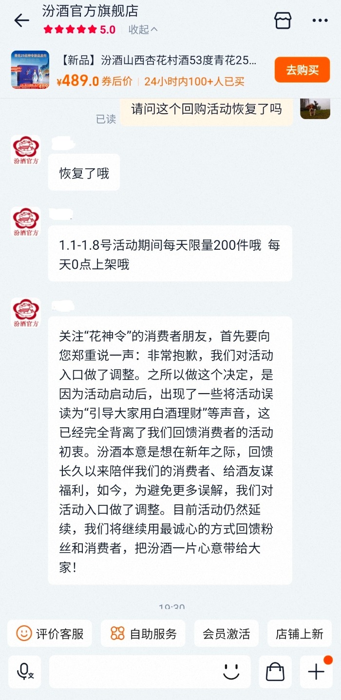 1月6日晚,汾酒官方旗舰店客服人员回复表示,相关商品的回购活动已恢复