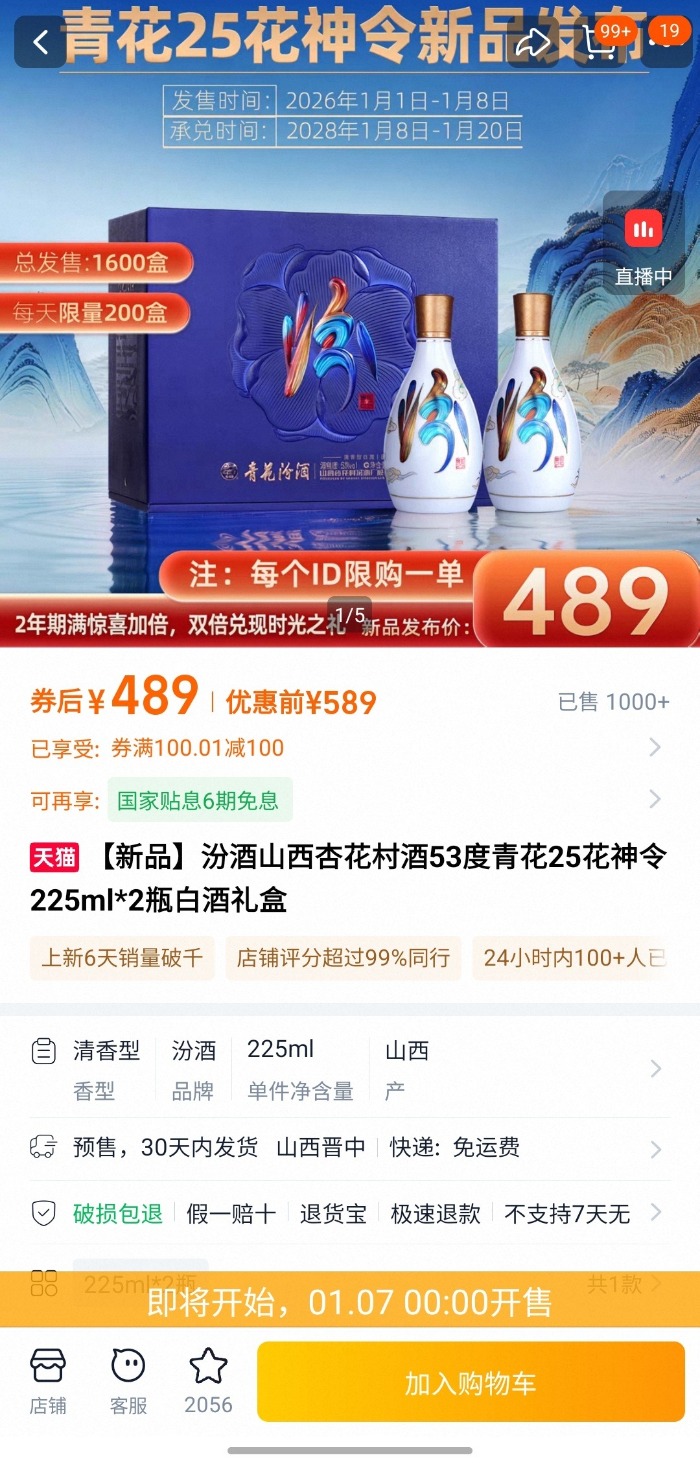 大皖新闻讯据某网购平台汾酒官方旗舰店发布的信息显示,2026年1月1日发售一款名为“青花25花神令”的新品,总发售1600盒,每天限量200盒,发售时间是2026年1月1日至1月8日,在此期间成功支付的订单,将以“双倍于您的实际支付金额(不超于新品价489元)回购”。“现在买两瓶白酒,两年后还能双倍价卖回去?”汾酒这一新品近期引发舆论关注。