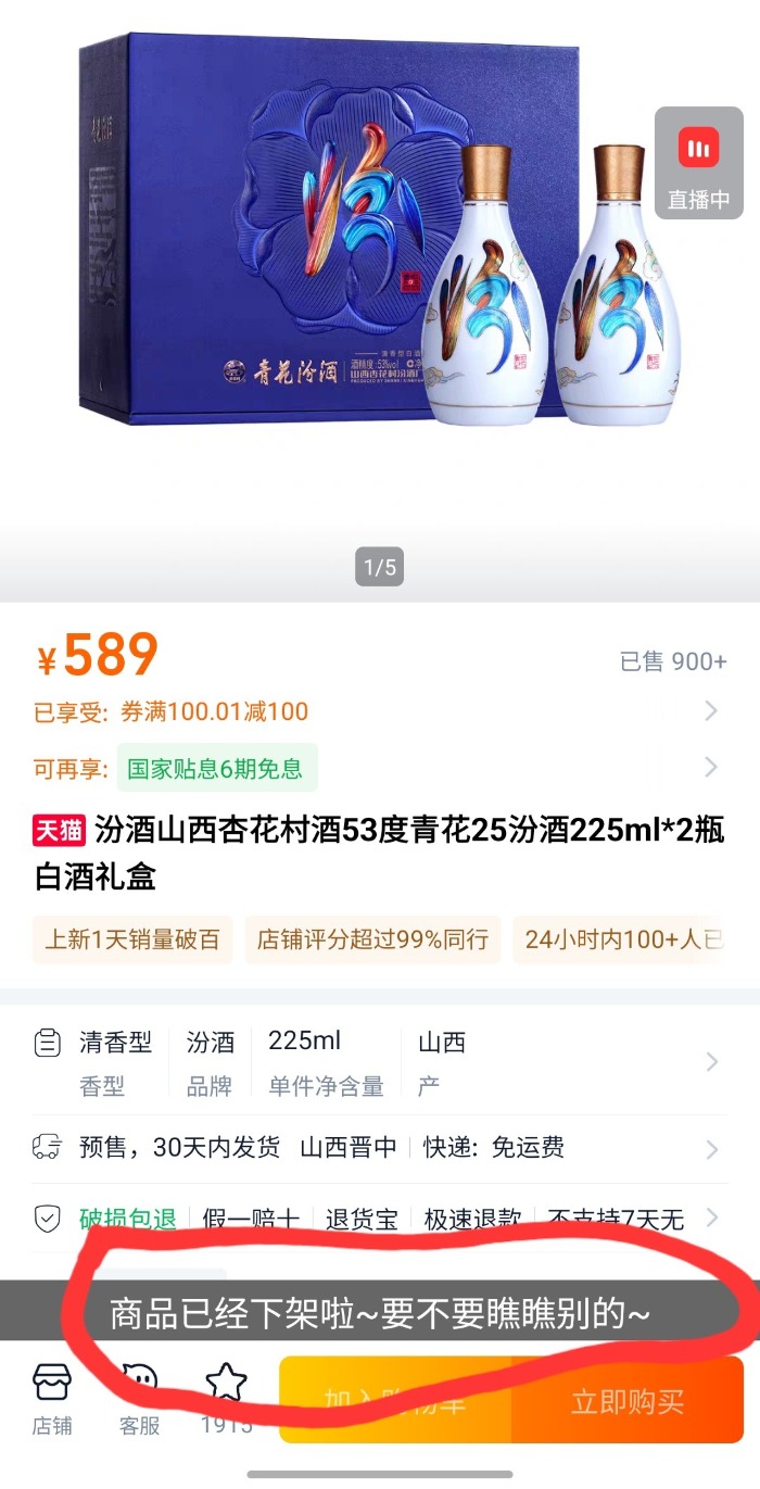 1月5日,大皖新闻记者在某网购平台的汾酒官方旗舰店向客服询问该产品的相关情况时,客服人员曾表示,“刚接到通知回收活动结束了哦。”5日晚7点多钟,大皖新闻记者在该旗舰店发现,打开上述新品的链接后,页面提示“商品已经下架”。
