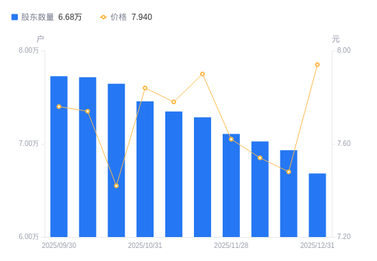 近一年(2024年12月31日至2025年12月31日),远东传动A股股东户数从6.86万户,减低至6.68万户,降幅2.58%,区间股价上涨23.10%。