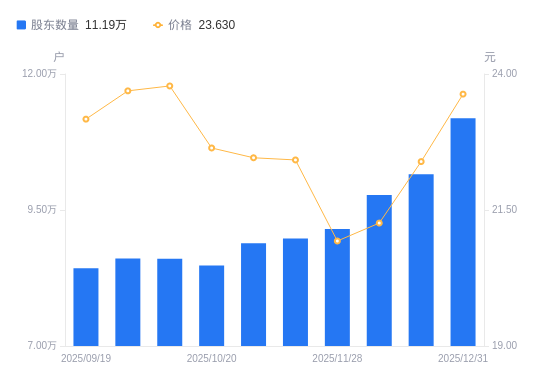 日期A股户数(户)流通A股户均持股数(股)户均持股市值(万元)2025-12-3111187112452.2829.422025-12-1910157713714.2230.712025-12-109773514253.3330.302025-11-289149215225.9131.872025-11-108978315515.7334.792025-10-318890015669.8435.192025-10-208480116427.2737.192025-10-108603116192.4138.512025-09-308609116181.1238.332025-09-198428816527.2538.29