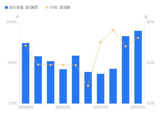 日期A股户数(户)流通A股户均持股数(股)户均持股市值(万元)2025-12-311006194567.846.872025-12-19984704667.536.772025-12-10856505366.168.322025-11-28836665493.418.112025-11-20844165444.616.582025-11-10908365059.806.762025-10-31854845376.587.192025-10-20886605183.986.932025-09-30905965073.206.792025-09-19957864798.326.99