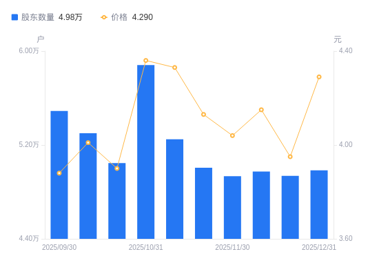 日期A股户数(户)流通A股户均持股数(股)户均持股市值(万元)2025-12-314984028321.4812.152025-12-194937428588.7911.292025-12-104974228377.2811.782025-11-304933928609.0711.562025-11-205006228195.8911.642025-11-105247826897.8011.652025-10-315881623999.3010.462025-10-205046127972.9410.912025-10-105299826633.8910.682025-09-305489125715.389.98