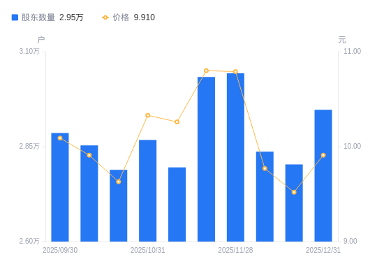 日期A股户数(户)流通A股户均持股数(股)户均持股市值(万元)2025-12-312947011966.3511.862025-12-192803212580.2011.982025-12-102836912430.7612.142025-11-283042811589.6012.512025-11-203033411625.5112.562025-11-102795512614.8612.942025-10-312867512298.1112.702025-10-202789012644.2612.182025-10-102853212359.7512.252025-09-302885812220.1212.33