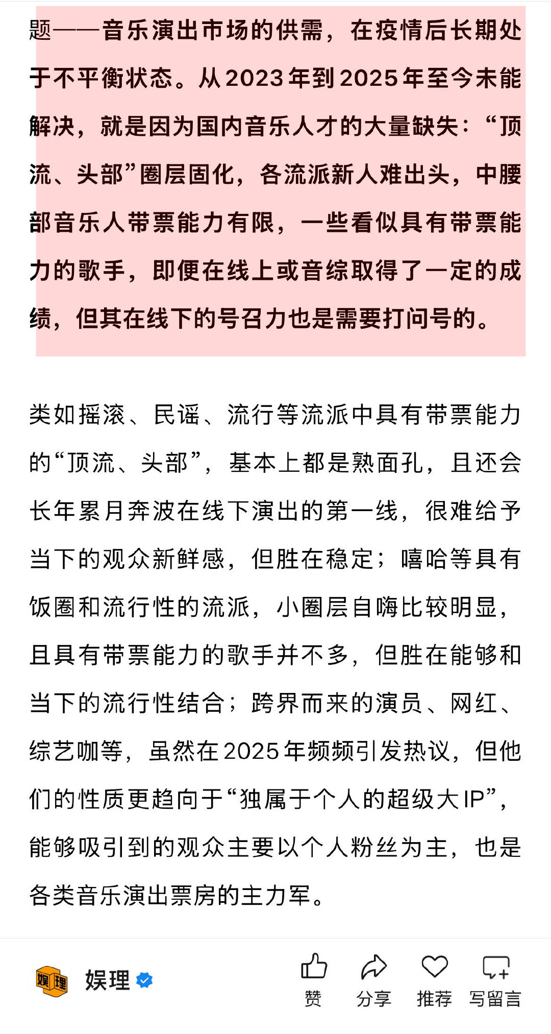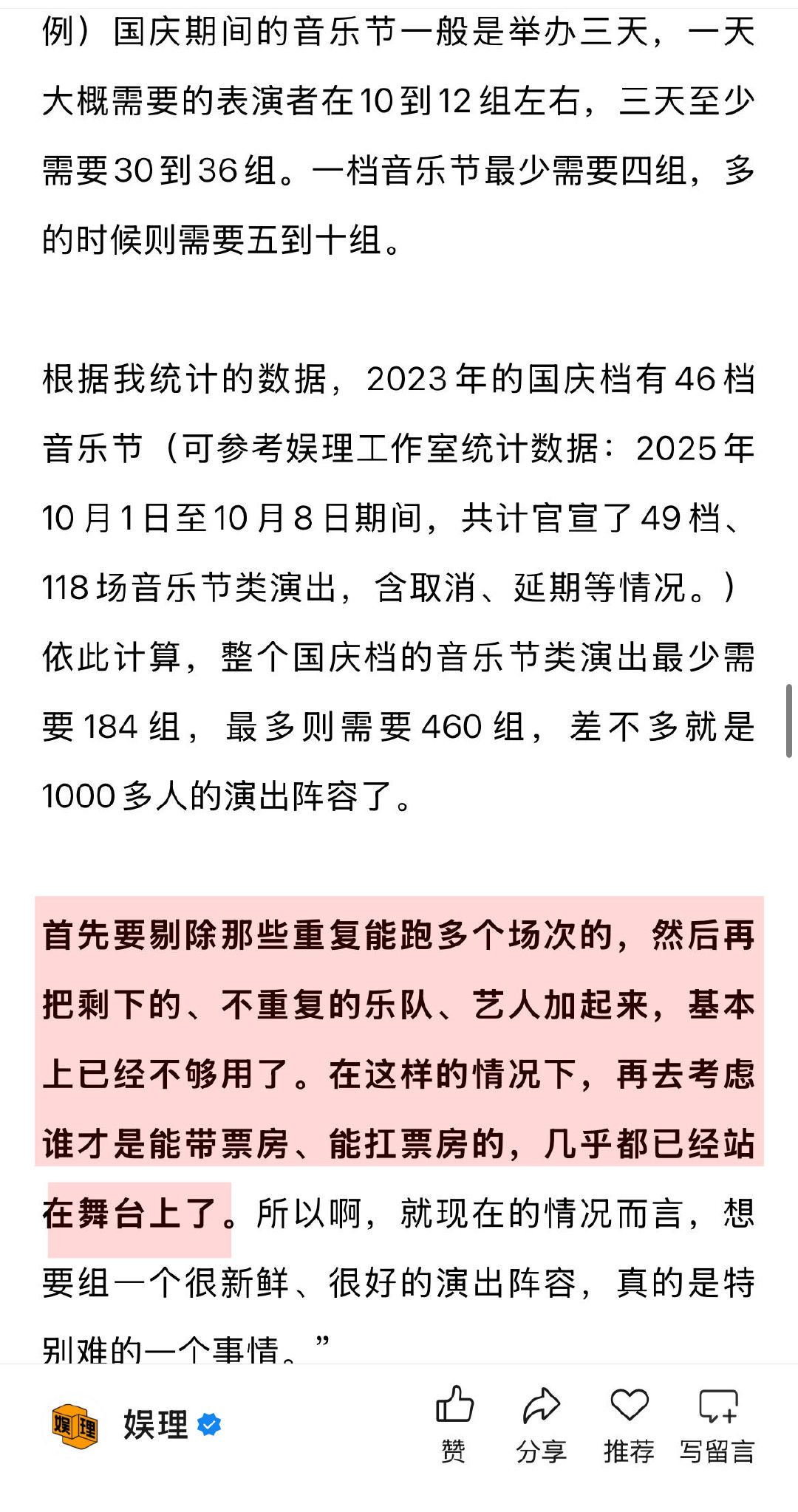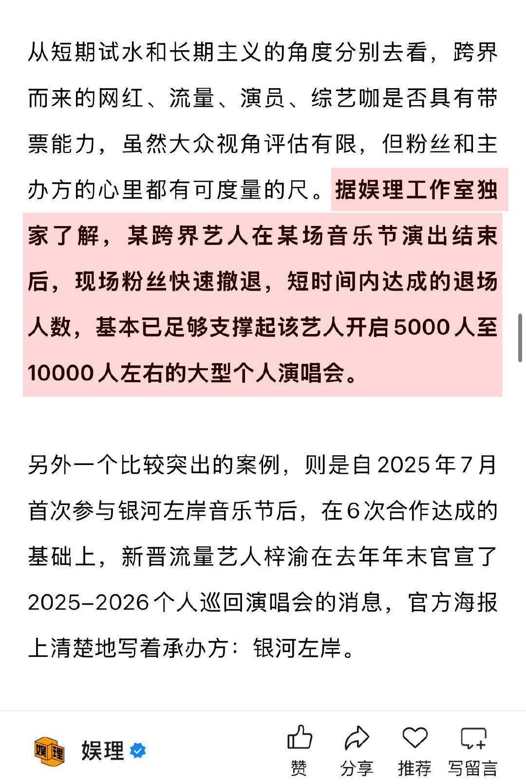 业内谈个人演唱会越来越多的原因 业内说跨界流量音乐节秀费超百万 就音乐演出市场的特性而言,阵容同质化的问题目前主要聚焦在音乐节等带有“拼盘类性质”的演出中,“剔除那些重复能跑多个场次的,然后再把剩下的、不重复的乐队、艺人加起来,基本上已经不够用了。在这样的情况下,再去考虑谁才是能带票房、能扛票房的,几乎都已经站在舞台上了。就现在的情况而言,想要组一个很新鲜、很好的演出阵容,真的是特别难的一个事情。”娱理独家↓