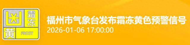 福州市气象台17时00分将霜冻蓝色预警信号升级为霜冻黄色预警信号:受冷空气影响,今天夜里到7日早晨福州市气温较低,晋安区(寿山乡、宦溪镇、日溪乡)最低气温-2℃~0℃,有霜或霜冻,局部有结冰,马尾区(亭江镇)最低气温2℃~4℃,有霜或霜冻。请注意防范!