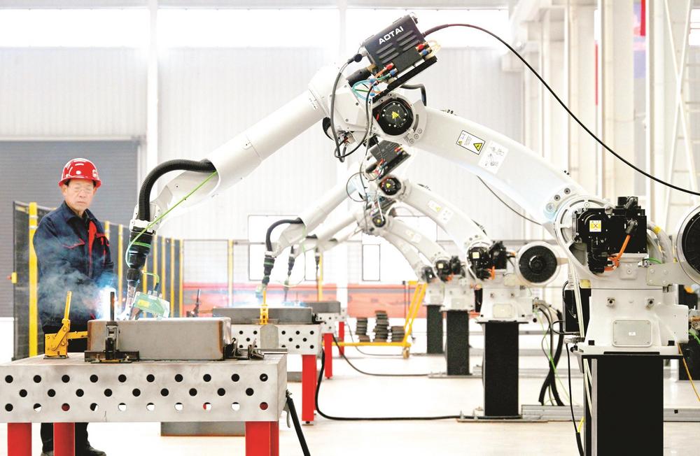 新年伊始,工人们加紧生产,赶制订单,力争实现新年“开门红”。图为1月4日,在广平县邯郸极驰汽车股份有限公司车间,工人利用机械臂焊接标准零部件。
