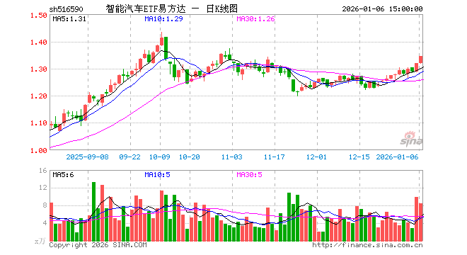1月6日,智能汽车ETF易方达(516590)涨1.90%,成交额1124.39万元。当日份额减少300.00万份,最新份额为6401.50万份,近20个交易日份额减少1000.00万份。最新资产净值计算值为8609.38万元。