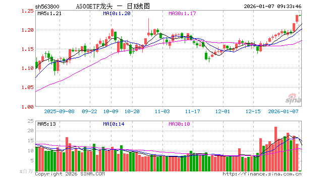 1月7日,A500ETF龙头(563800)开盘涨0.00%,报1.236元。A500ETF龙头(563800)重仓股方面,宁德时代开盘跌0.28%,贵州茅台涨0.34%,中国平安跌0.58%,招商银行涨0.05%,紫金矿业涨0.00%,新易盛涨2.03%,中际旭创涨1.91%,美的集团涨0.19%,东方财富跌0.92%,长江电力涨0.00%。