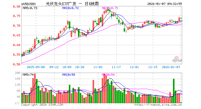 1月7日,光伏龙头ETF广发(560980)开盘跌0.14%,报0.739元。光伏龙头ETF广发(560980)重仓股方面,阳光电源开盘跌1.23%,特变电工涨0.76%,TCL科技跌1.22%,正泰电器涨0.14%,晶盛机电涨0.08%,德业股份跌0.18%,捷佳伟创跌0.83%,科华数据跌0.53%,锦浪科技跌0.25%,阿特斯跌1.41%。