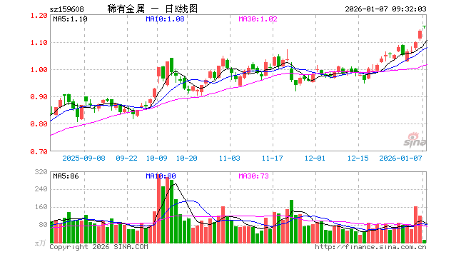 1月7日,稀有金属ETF(159608)开盘涨1.76%,报1.158元。稀有金属ETF(159608)重仓股方面,北方稀土开盘涨2.39%,洛阳钼业涨1.01%,华友钴业涨3.55%,盐湖股份跌0.06%,赣锋锂业涨0.15%,天齐锂业涨0.88%,中国稀土涨2.27%,中矿资源涨0.33%,盛和资源涨1.56%,西部超导跌0.03%。