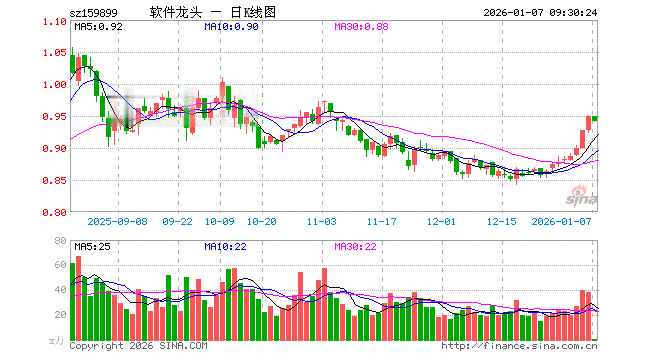 1月7日,软件龙头ETF(159899)开盘涨0.00%,报0.950元。软件龙头ETF(159899)重仓股方面,科大讯飞开盘涨0.04%,同花顺跌1.99%,金山办公跌0.21%,指南针跌2.13%,恒生电子跌0.22%,润和软件跌0.21%,三六零跌0.62%,拓维信息涨0.00%,用友网络跌0.58%。