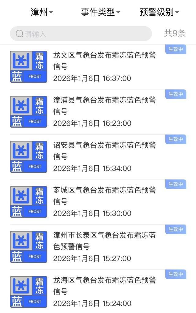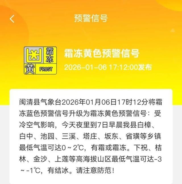 泉州市气象台2026年01月06日16时42分发布霜冻蓝色预警信号:预计今天夜间至7日早晨,洛江区虹山乡、罗溪镇、马甲镇和泉港区涂岭镇的最低气温2~4℃,有霜或霜冻。请注意防范!