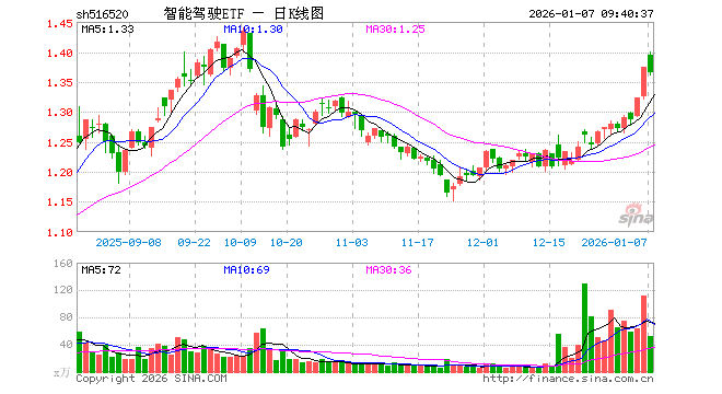 1月7日,智能驾驶ETF(516520)开盘涨1.46%,报1.394元。智能驾驶ETF(516520)重仓股方面,立讯精密开盘跌0.37%,芯原股份涨2.82%,拓普集团跌1.20%,豪威集团涨0.70%,科大讯飞涨0.04%,德赛西威涨1.89%,闻泰科技涨0.97%,欧菲光涨0.09%,均胜电子跌0.24%,思特威涨0.02%。