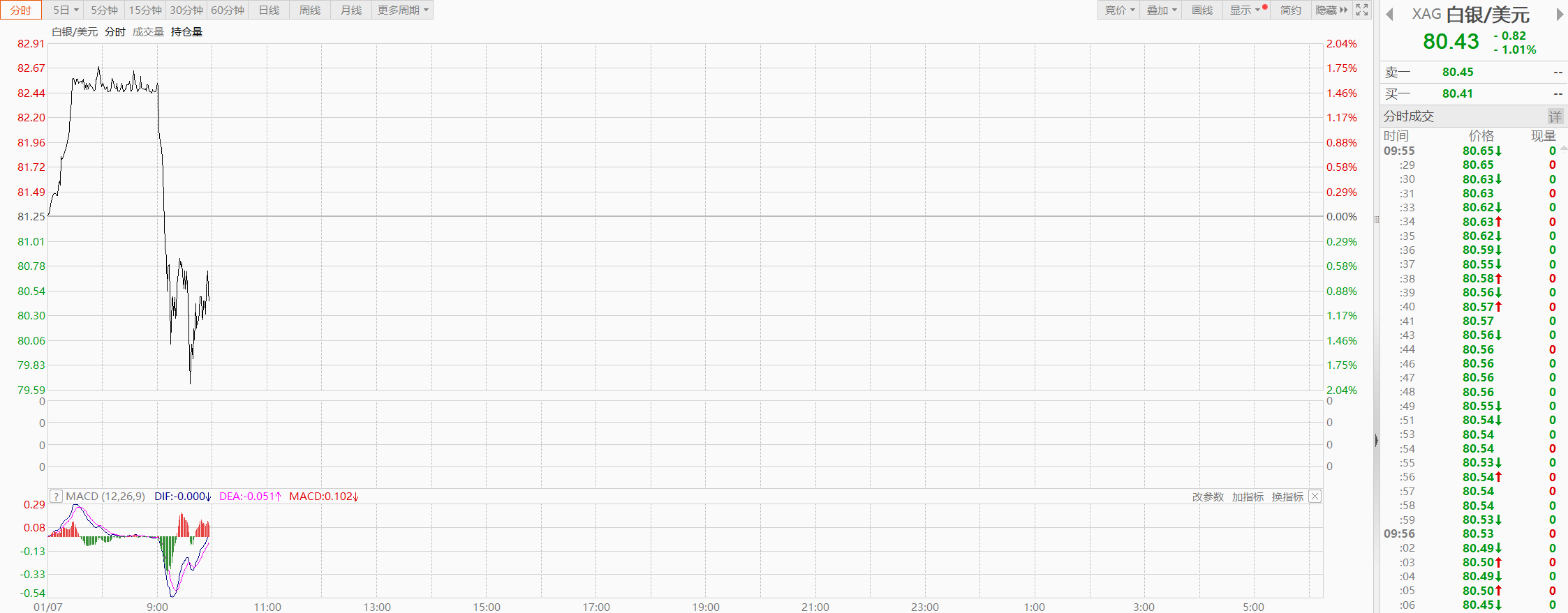 2026年1月7日早9点,现货白银价格盘中快速下杀,一度跌破80美元/盎司,最大跌幅近2%。