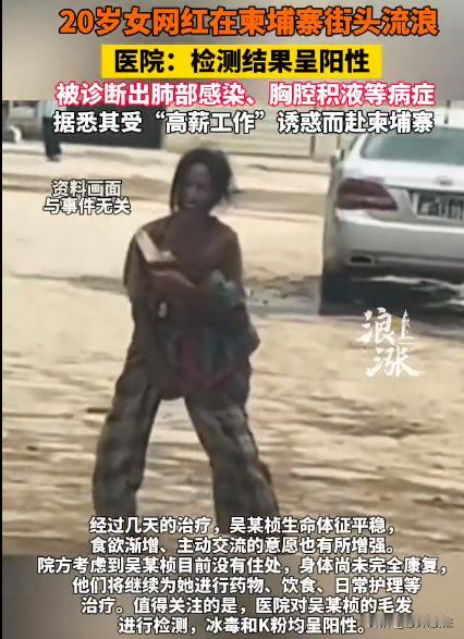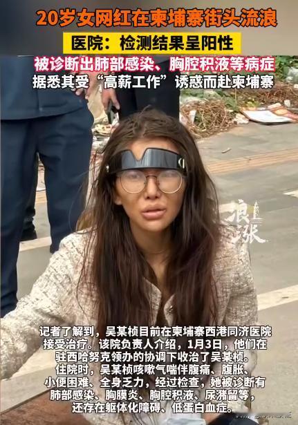 天上的馅饼会砸到你吗? 越是诱人的条件越有毒呀! 福建籍女子吴某桢流落柬埔寨街头。 受“高薪工作”诱惑而赴柬埔寨,结果20岁女网红在柬埔寨街头流浪。被收治当地医院被诊断出肺部感染、胸腔积液等多种病症,她的毒品检测结果呈阳性。对吴某桢的毛发进行检测,冰毒和K粉均呈阳性。 这样的结局令人痛惜,到底遭遇了什么不得而知,但粘上各种毒品说明,精神和身体都折腾的不行了。缅甸诈骗等犯罪园区经过我们高压打击不行了,柬埔寨反而受益了。作为普通人,不能企望一夜暴富或是天降横财,你盯上了别人的钱,而别人盯上了你的剩余价值。 一句话没有金刚钻别揽瓷器活,人生财富就和炒股一样,你只能赚取你认知以内的钱。超过认知以外的钱,会让你赔的一地鸡毛,怎么赚到的,就怎么凭实力还回去。