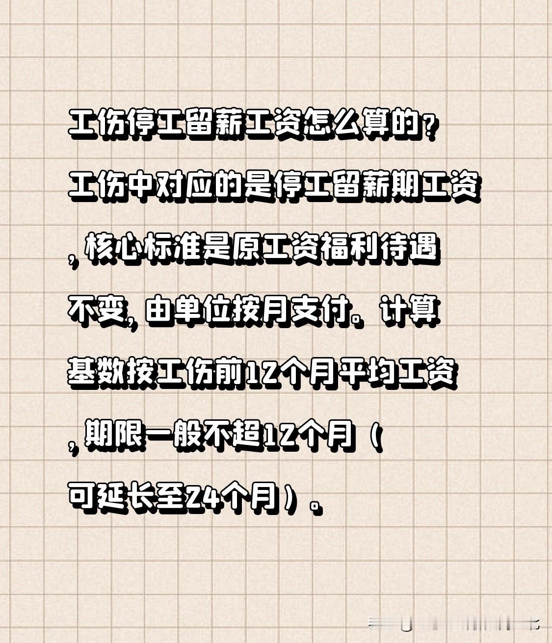 工伤停工留薪工资怎么算的? 工伤中对应的是停工留薪期工资,核心标准是原工资福利待遇不变,由单位按月支付。计算基数按工伤前12个月平均工资,期限一般不超12个月(可延长至24个月)。 一、核心标准(依据《工伤保险条例》第33条) ● 计算基数:按工伤前12个月平均工资(含奖金、津贴等);未满12个月按实际工作月数平均;本人工资高于统筹地区职工平均工资300%的按300%算,低于60%的按60%算。 ● 支付主体:所在单位按月支付,工伤保险基金不直接支付此费用。 ● 期限:一般不超12个月;伤情严重/特殊的,经市级劳动能力鉴定委员会确认可延长,延长不超12个月,最长24个月。 ● 停发节点:评定伤残等级后停发,改按规定享受伤残待遇。 二、常见计算示例 ● 月薪固定5000元,停工留薪3个月:5000×3=15000元。 ● 日薪/计件:工伤前12个月平均日工资×误工天数。 ● 工作未满12个月:实际月均工资×停工留薪月数。 三、特殊情形说明 ● 单位未参保:仍由单位按上述标准支付,不得拒付。 ● 非工伤的侵权误工:按《最高法人身损害解释》,有固定收入按实际减少算,无固定收入按近三年平均算,无法举证则参照当地同行业上年度职工平均工资。 需要我根据你的情况(工伤前12个月平均工资、停工留薪月数、统筹地区)帮你算出具体金额吗?