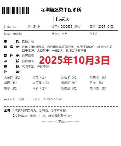 有个深圳本地的糖尿病患者,去年9月11号查出了高血糖,第二天就过来看诊。他的体型较胖,平时出虚汗多,大便不成形,每天四五次,腰酸尿频,看诊时空腹血糖7.6,糖化6.2,我给出的辨证是气阴不足,脾运不健;没想到只吃了10天中药,空腹血糖和胰岛素抵抗就正常了,人也顺利减肥6KG!