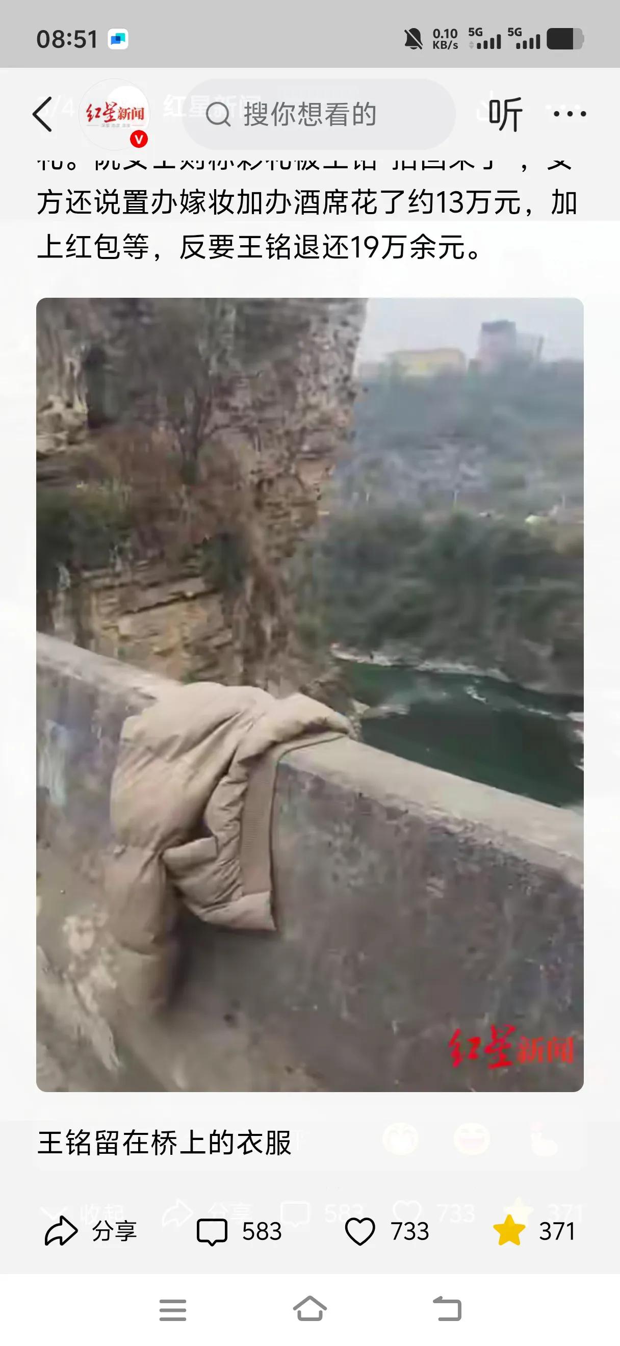 又一起因为彩礼引发的悲剧。贵州二十六岁男子王某娶二婚女。结婚22天分手。 女的二十四岁,离过一次婚,有一个女儿,女的有不良嗜好,抽烟喝酒。因为抽烟喝酒两个人才吵架的。 去年7月份经过媒人介绍认识,8月见了双方父母,9月订婚。10月1日办的婚礼,没有扯结婚证。10月23号分手。 男方想要回彩礼,前前后后花了十几万加红包,加办酒席。 那女方说自己家办酒席花了13万加上亲戚家给男方的红包。现在想让男方退还女方自己19万。 男的整个人就懵了。2024年12月28日凌晨,王某从离家出走。早晨6:50从当地的万寿桥跳下去。桥离河面十八九米,水深10m。12月29日下午,王某被打捞上来,至今没有下葬。