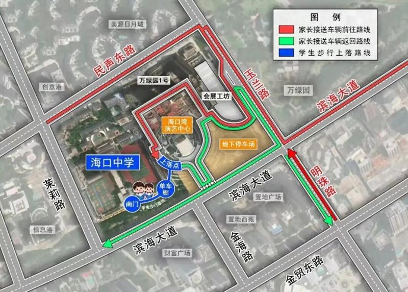 交管部门同时公布了家长接送车辆推荐行驶路线。其中前往路线为:滨海大道、明珠路、民声东路→玉兰路→演艺中心内部道路→临时上落点;返回路线为:临时上落点→演艺中心内部道路→玉兰路→滨海大道、明珠路。学生步行上落路线为:海口中学南门→单车棚→临时上落点。