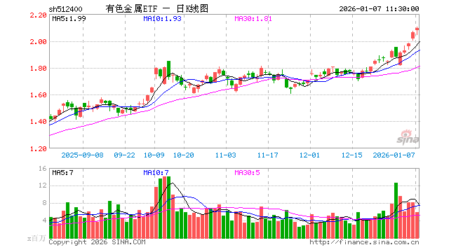 1月7日,截止午间收盘,有色金属ETF(512400)涨1.60%,报2.093元,成交额12.11亿元。有色金属ETF(512400)重仓股方面,紫金矿业截止午盘跌1.22%,北方稀土涨6.09%,洛阳钼业涨2.58%,华友钴业涨5.66%,山东黄金跌0.17%,赣锋锂业跌0.54%,中国铝业涨1.22%,中金黄金涨0.65%,赤峰黄金跌1.25%,天齐锂业跌0.54%。