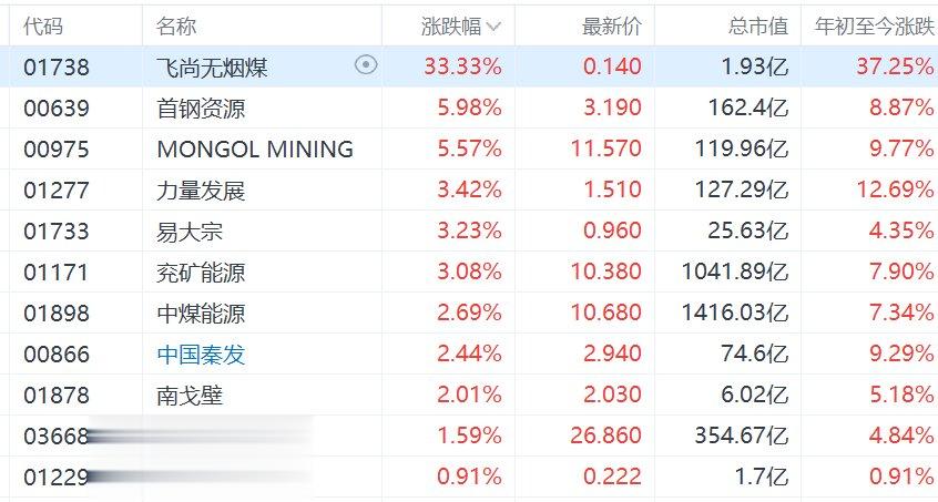 港股异动丨煤炭股走强,易大宗、兖矿能源涨超3%