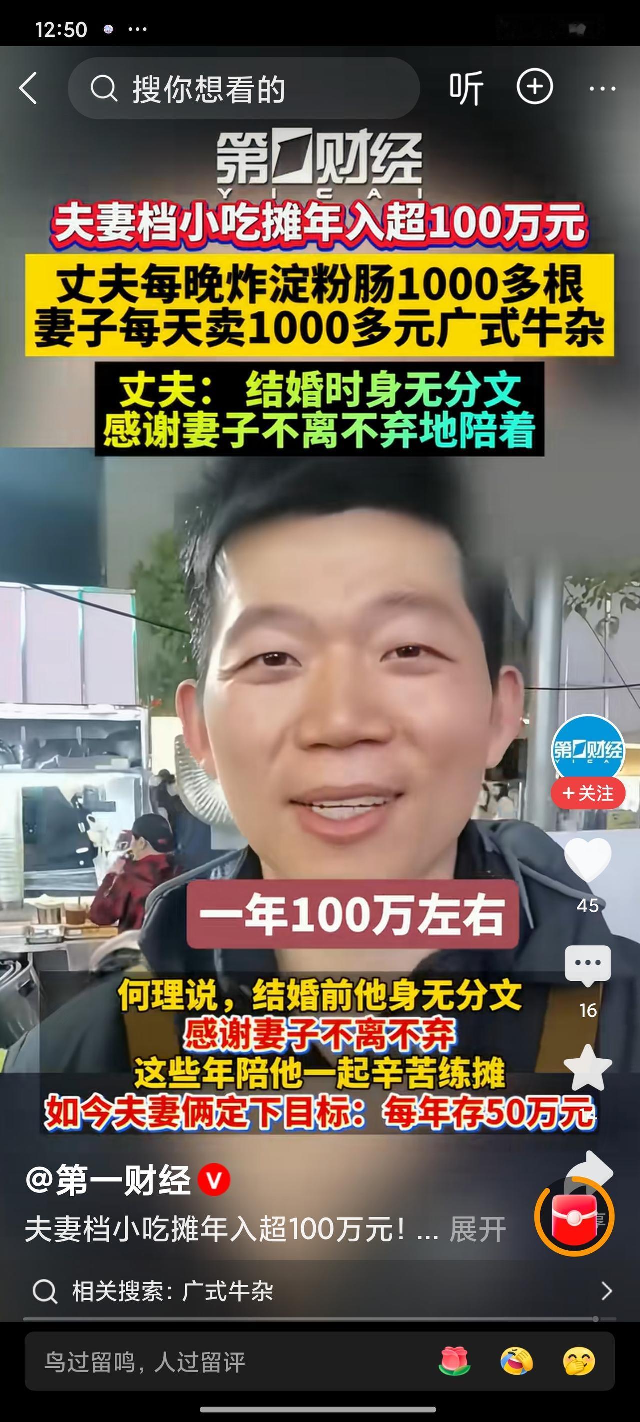 荆州夫妻太拼了!每晚炸1100根淀粉肠,8年赚百万买房买车 荆州长新夜巷藏着真·励志故事!夫妻摆摊8年,靠炸淀粉肠年入百万,房子车子全配齐~ 老板何理的右手食指关节早肿变形,天天颠漏勺炸串磨的!但他有个死规矩:炸油绝不隔夜,食材新鲜分量足。 现在每晚500根年糕+1100根淀粉肠不够卖,妻子的牛杂摊也火爆,高峰一天卖5000+! 多亏美食街改造,固定摊位月租才1100,配套停车场+公厕,游客学生挤着来,节假日单日2万人打卡~ 网友:这钱挣得太干净!手指起茧的背后,全是踏实日子❤️ 没有捷径,全靠坚持!普通人的暴富,藏在日复一日的烟火气里~ 你努力工作挣钱是为了什么?