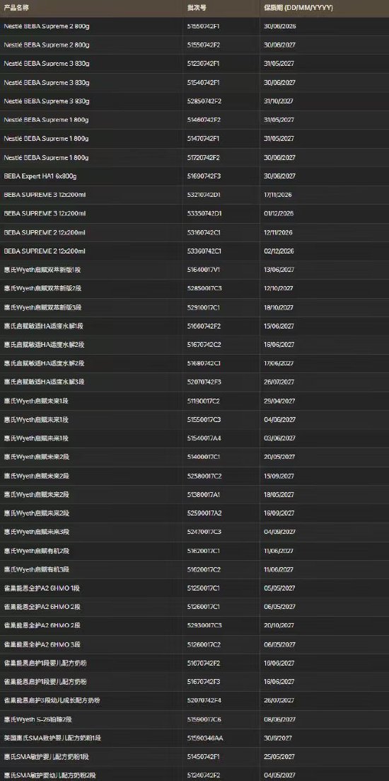 雀巢公司在其网站发布声明说,已对可能受影响的产品进行了花生四烯酸(ARA)油脂及相关油脂混合物检测。截至目前,尚未接到因食用该配方奶粉导致不适或患病的报告。